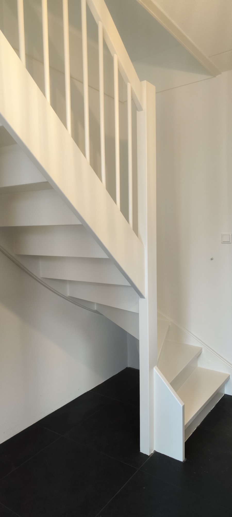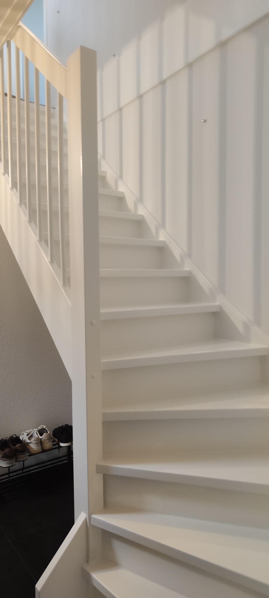 Deze binnentrap voorzien van nieuw schilderwerk, als basis een dekkende primer waarna afgelakt met een verharde trappenlak.